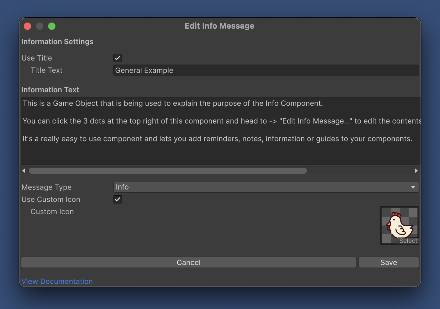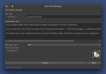 - Attach contextual information to any GameObject using rich text areas.Info Boxes in the Inspector