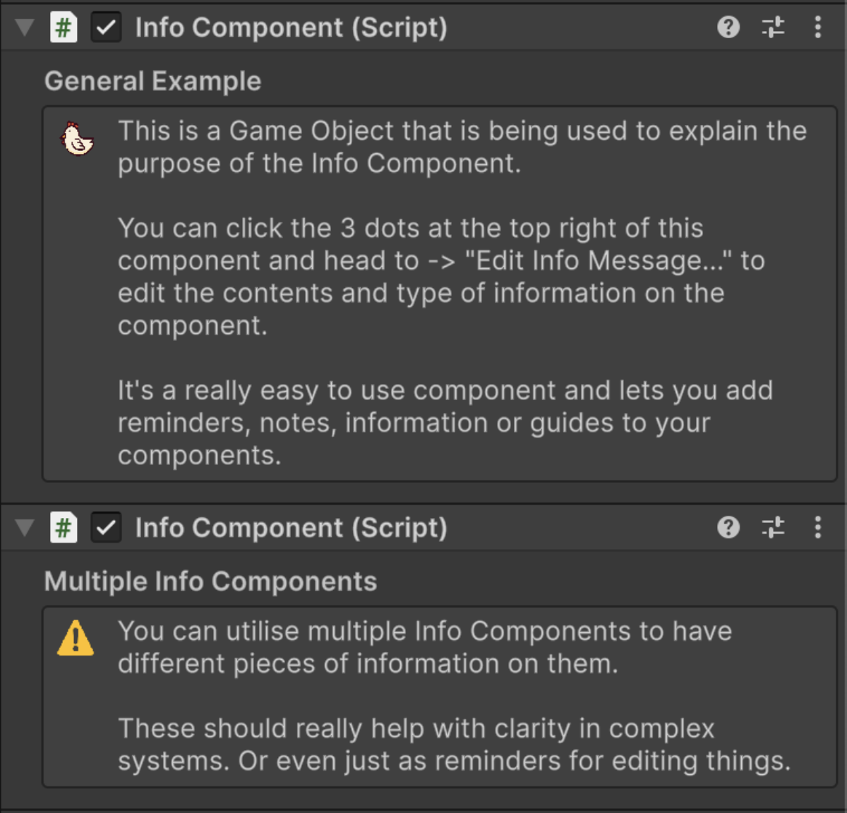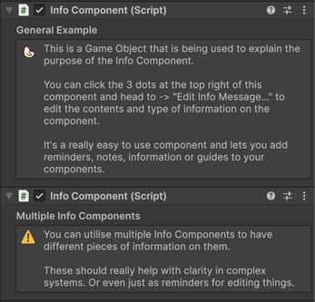 - Add several Info Components to a single GameObject — each with its own text, type, and icon.Multiple Components per Object